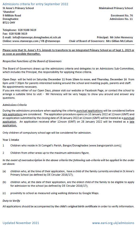 This is an exciting time to be joining St. Anne's PS as we embark on our journey to become Donagahdee's first Integrated Primary School. If you would like your child to attend a primary school that welcomes families from all cultures and backgrounds, then make us your first choice on the Enrolment application form here.